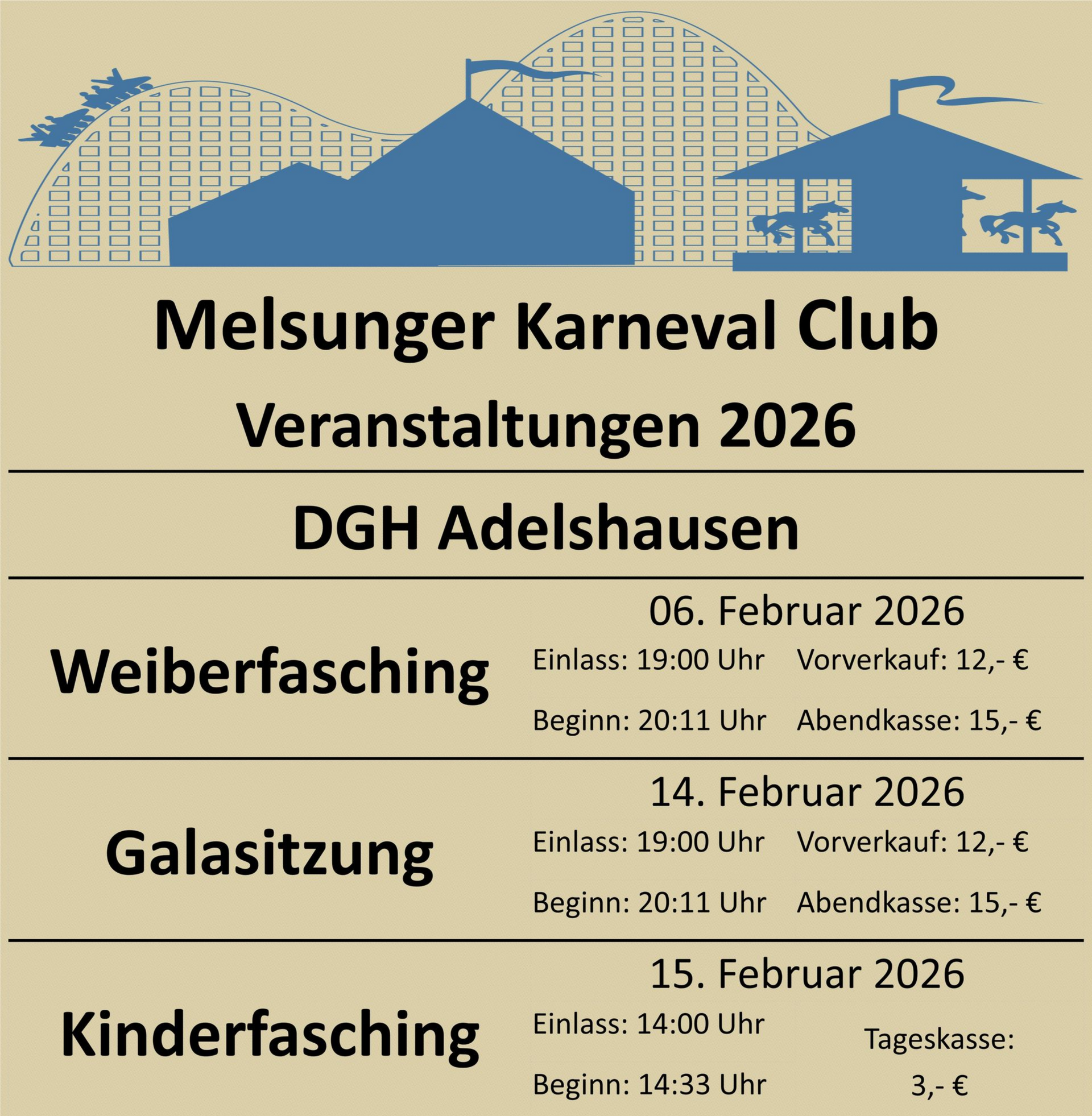 Der Melsunger Karneval Club lädt herzlich zu den Veranstaltungen der Kampagne 2026 in der DGH Adelshausen ein.